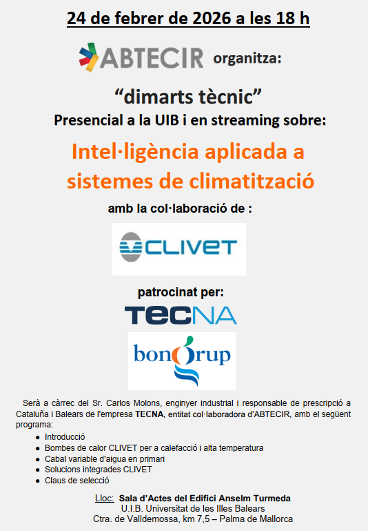 Sr. Carlos Molons, enginyer industrial i responsable de prescripció a Cataluña i Balears de l’empresa TECNA, entitat col·laboradora d’ABTECIR, amb el següent programa: