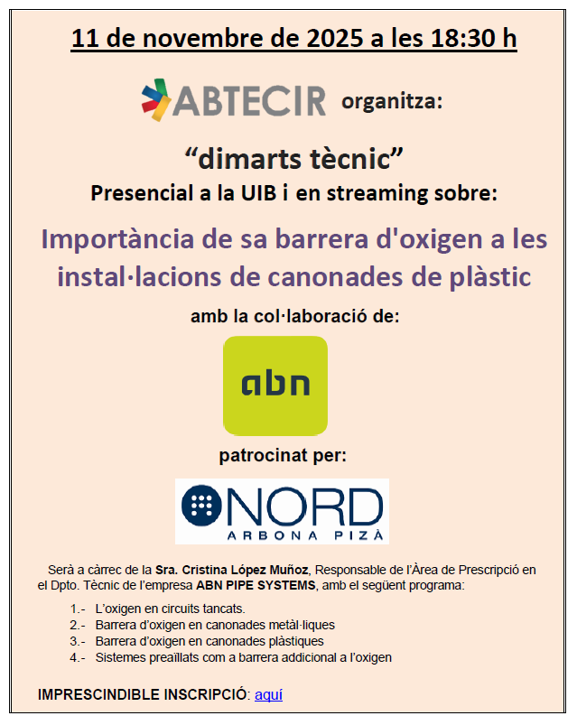 Serà a càrrec de la Sra. Cristina López Muñoz, Responsable de l’Àrea de Prescripció en el Dpto. Tècnic de l’empresa ABN PIPE SYSTEMS, amb el següent programa: